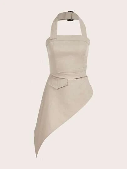 Aveloria Affinna Parte superior de cuello de halter de unicolor con dobladillo asimétrico, moda de verano para mujeres - Caqui - Añade 2