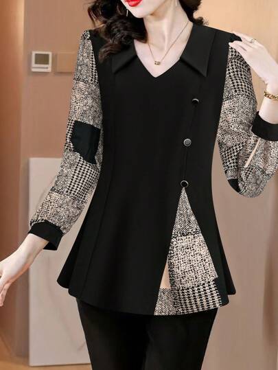 EMERY ROSE Blusa de manga larga con estampado pata de gallo de dos tonos para mujer, adelgazante - Negro - Añade 7