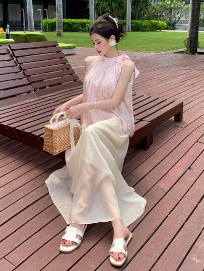 DAZY Conjunto de dos piezas para mujer de vacaciones con parte superior halter con estampado floral pequeño y falda de unicolor - Rosa Pálido - Añade 1