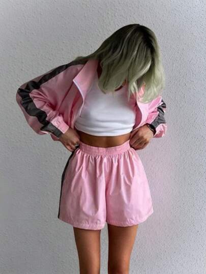 INAWLY Conjunto casual de 2 piezas para mujer: chaqueta con cremallera y shorts, conjunto en color rosa - Rosa - Añade 2