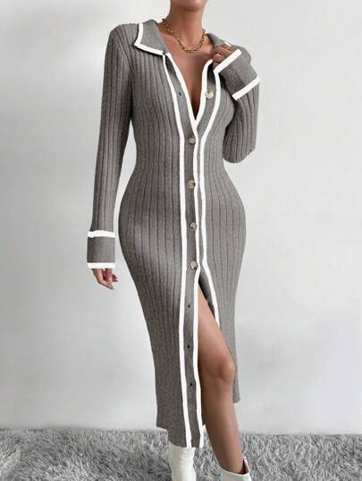 SHEIN Clasi Vestido de suéter ajustado con botones frontales y ribete de bloques de color para mujer, ideal para otoño/invierno - Multicolor - Añade 1