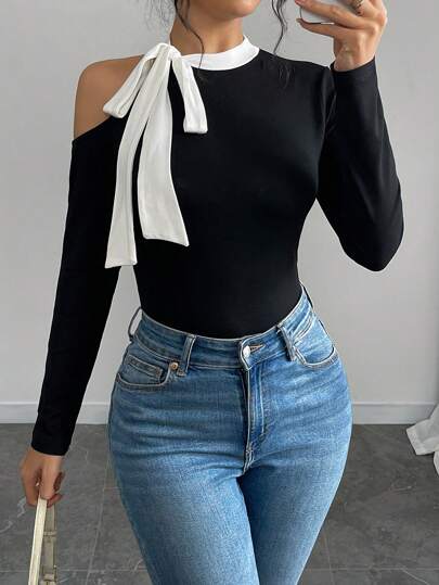 Chiquease Camiseta básica de manga larga con bloqueo de color y cordones para mujer, apta para otoño/invierno - Negro - Añade 1