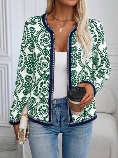 SHEIN LUNE Chaqueta larga con manga larga, estilo casual/diario, con diseño asimétrico, encaje y flecos en el frente abierto, para mujer - Verde - Añade 1