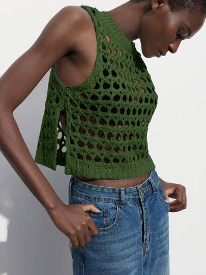 Maija Conjunto de primavera y verano 2026 para mujer: Blusa de punto verde de unicolor con cuello redondo, abertura lateral transparente y calada; Top de hombros descubiertos, estilo de vacaciones; Conjunto de playa para mujer; Atuendos de vacaciones para mujer - Verde - Añade 5