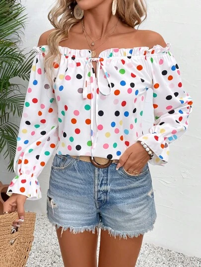 SHEIN VCAY Camisa de mujer con hombros descubiertos y estampado de lunares de colores - Blanco - Añade 5