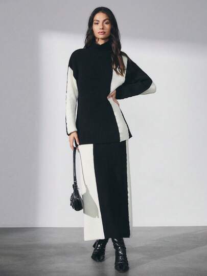 RueChic Conjunto casual de 2 piezas de suéter de cuello redondo con empalmado de colores contrastantes + falda A-line de punto para mujer - Negro - Añade 4