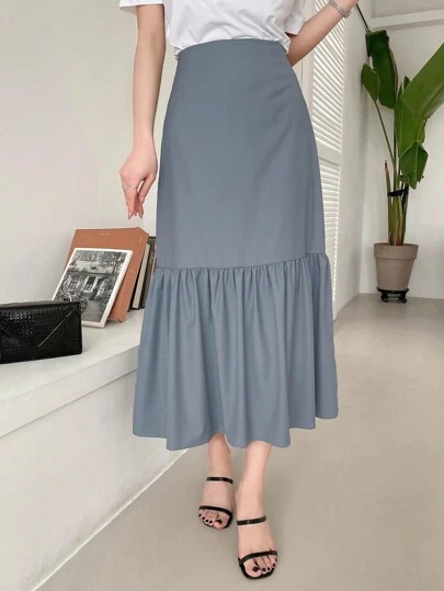 DAZY Falda larga de línea A de cintura alta de unicolor de moda para mujer, faldas de otoño - Azul - Añade 7
