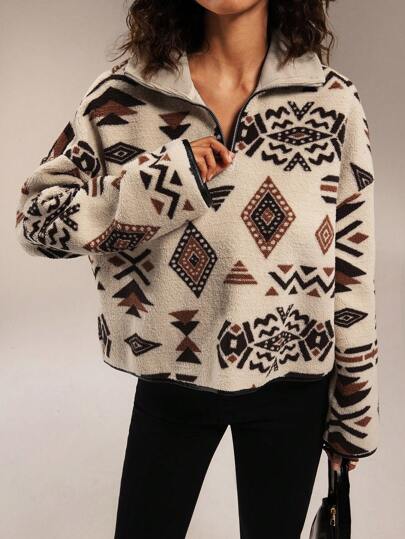 Forever 21 Chaqueta de lana con mangas largas y hombros caídos con patrón geométrico para mujer, otoño - Albaricoque - Añade 5