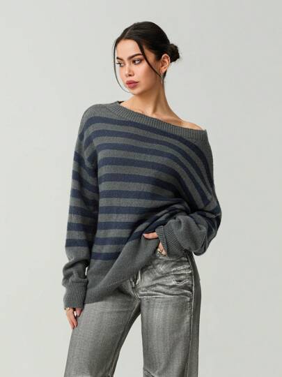 Jersey de punto para mujer de cuello redondo, manga larga, jersey de rayas cálido para otoño e invierno - Gris Oscuro - Añade 7