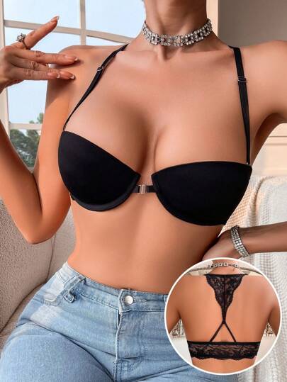 Sujetador con cierre delantero de encaje, con acolchado y push-up, con aros para mujer - Negro - Añade 2