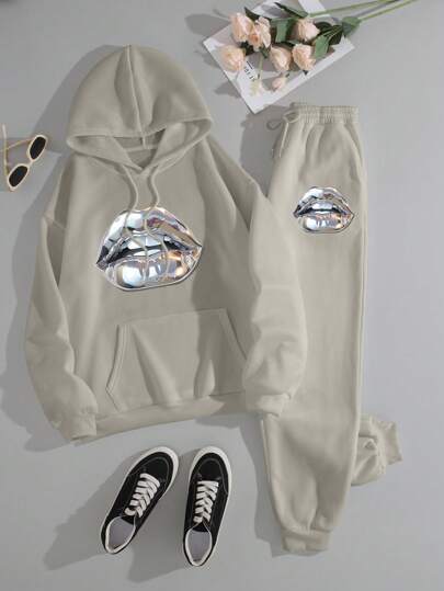 INAWLY Conjunto de 2 piezas de mujer con sudadera con capucha de manga larga con cordón y estampado de labios, y pantalones - Gris - Añade 1