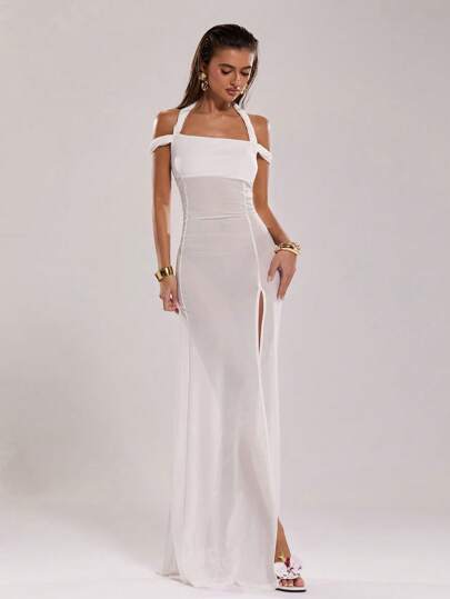 SHEIN BAE Vestido de cubrición sexy con abertura lateral, escote abierto en los hombros y unicolor para mujer - Blanco - Añade 4