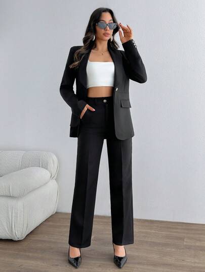 EURMUSE Conjunto de mujer de traje de chaqueta y pantalón con detalles de botones y bolsillos de un solo color - Negro - Añade 1