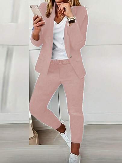 Conjunto de chaqueta y pantalones de unicolor informal de manga larga para mujer - Rosa vieja - Añade 1