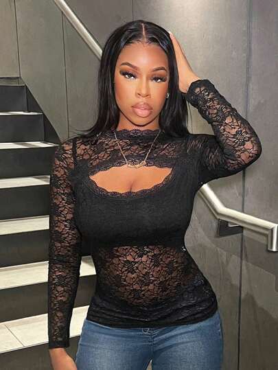 Zolique Blusa de mujer de unicolor, cuello redondo, calada, de manga larga transparente - Negro - Añade 8
