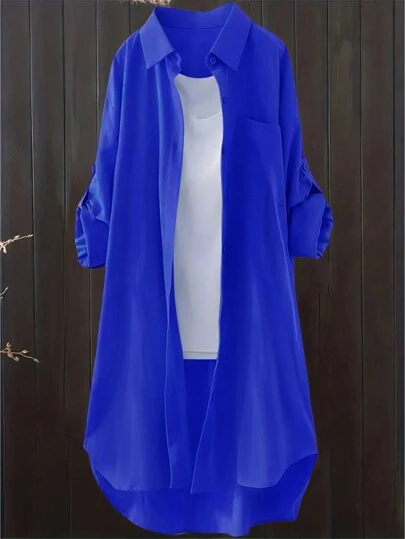Blusa de mujer informal de unicolor con mangas enrollables para primavera/otoño - azul real - Añade 1