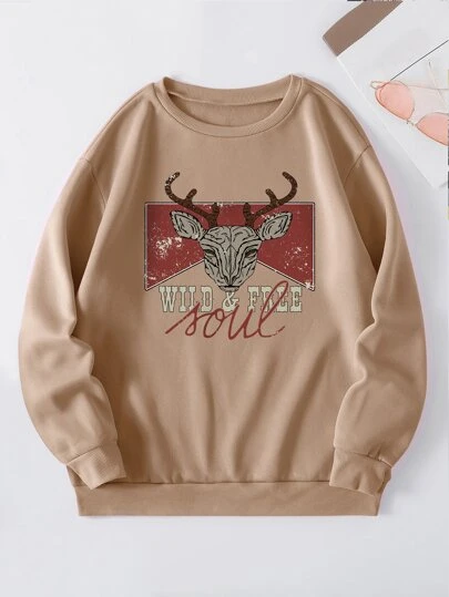 SHEIN EZwear Sudadera alce con con estampado de letra con forro térmico - Caqui - Añade 2