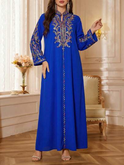 Solessence Vestido de manga larga con bordado floral de estilo árabe, para mujer, de uso casual en primavera/verano, estilo modesto tipo kaftan - Azul - Añade 1