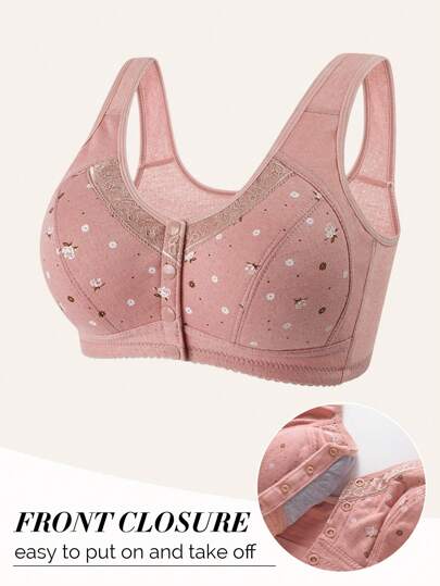 Sujetador suave y sin costuras con botones delanteros y estampado, prenda interior casual para tallas grandes con control anti-flacidez y control del bulto lateral - Rosa - Añade 5