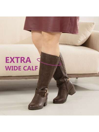 Botas de moto para mujer con pantorrilla extra ancha, tacón en bloque y elegante hebilla de cadena - Marrón - Añade 2