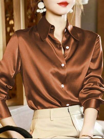 Blusa casual de mujer de un solo pecho de unicolor y manga larga - Marrón - Añade 1
