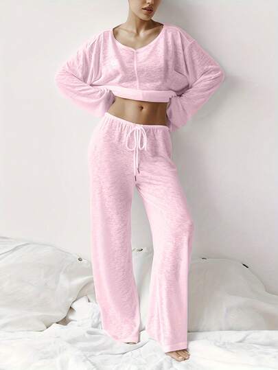 Conjunto de pijama para mujer de unicolor con tela semitransparente, cuello redondo, manga larga y pierna recta, ropa de estar en casa - Rosa - Añade 1