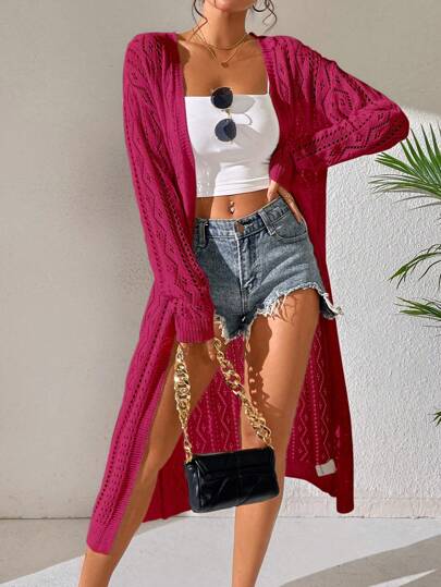 Kimono de punto de un solo color, de manga larga, simple y diario como cubierta para el verano de las mujeres - Rosa Fucsia - Añade 1