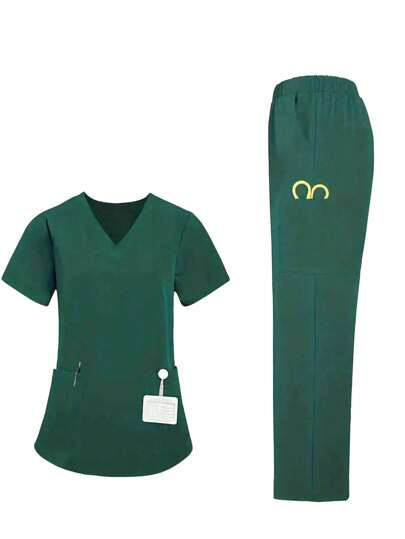 Conjunto uniforme de blusa de manga corta con cuello en V y bolsillo y pantalones de unicolor para mujeres - Verde - Añade 1