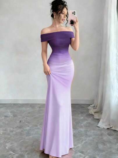 Vestido ajustado de mujer con hombros descubiertos y efecto degradado