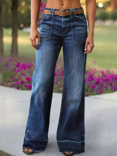 Jeans de pierna ancha y acampanada para mujer con bolsillos delanteros con forma de diamante - Azul lavado oscuro - Añade 1