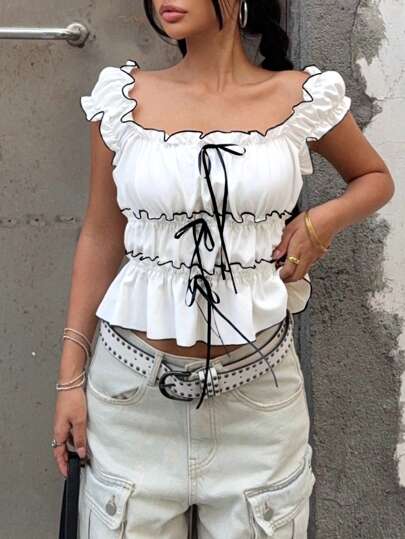 Top corto casual con cuello cuadrado, diseño de bloques de color y drapeado, estilizador para adolescentes/mujeres, primavera/verano - Blanco y Negro - Añade 1