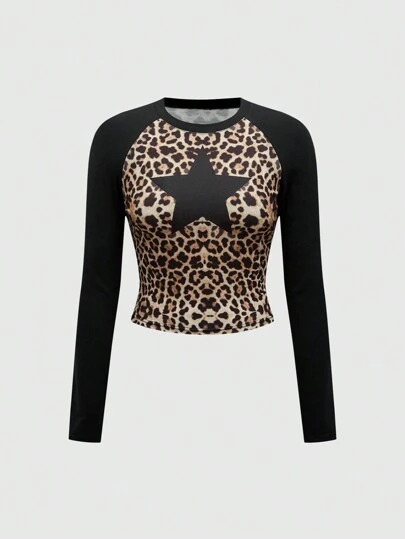 ROMWE Camiseta casual de manga larga con bloqueo de colores y estampado de estrella y leopardo Y2K - Negro - Añade 1