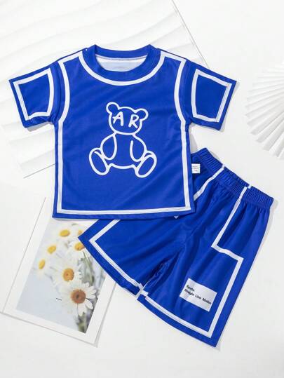 Chico joven Camiseta con estampado de oso & Shorts con estampado de letra - Azul - Añade 2