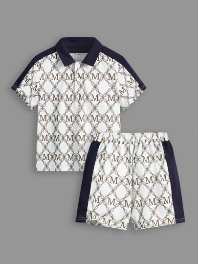 SHEIN Camisa Polo Y Pantalon Corto Para Niño Con Letras E Impresiones De Cadenas Y Cuello A Contraste - Multicolor - Añade 1