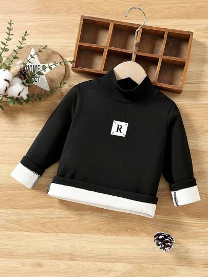 Chico joven Camiseta con parche de letra de cuello alto térmico - Negro - Añade 1