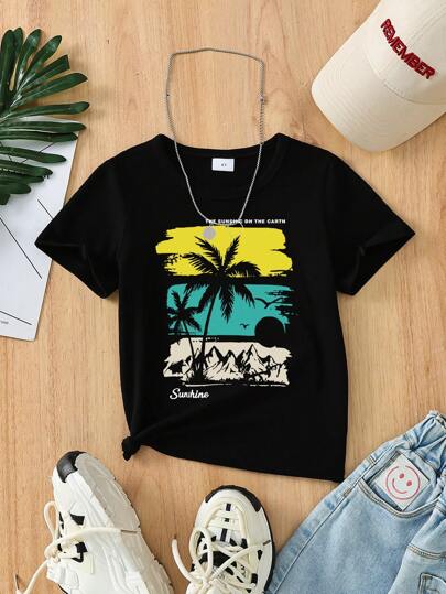 Camiseta casual con cuello redondo y diseño de palmera y letras para niño joven, adecuada para uso diario en primavera y verano - Negro - Añade 1