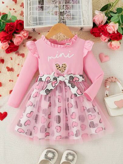 SHEIN Vestido casual de manga larga con estampado de letras y volantes para niña joven - Rosa - Añade 4