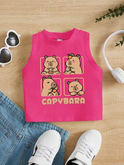 Blusa sin mangas de cuello redondo con diseño de dibujos animados sencilla e informal, apta para el verano, para niñas jóvenes - Rosa Fucsia - Añade 5
