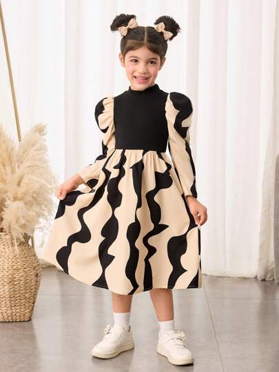 Vestido ajustado con volantes en las mangas y estampado de bloques de color para niña joven - Negro - Añade 1