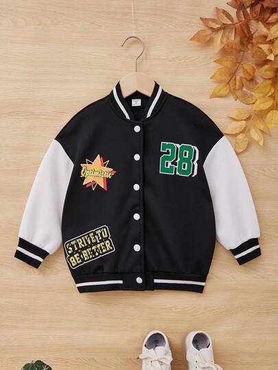 SHEIN Chica Joven Cazadora de universidad con estampado de letra ribete de rayas de hombros caídos - Negro - Añade 1