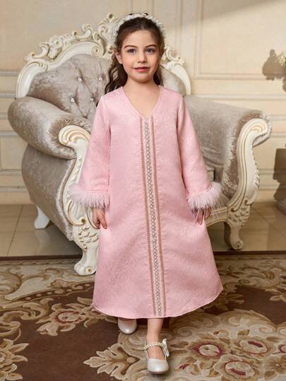 Vestido suelto con mangas abullonadas, cuello en V y empalmado con textura de felpa para niña joven - Multicolor - Añade 6