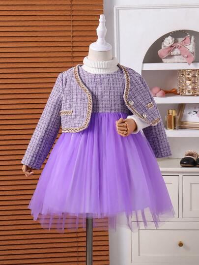 SHEIN Conjunto de chaqueta de botones de cuadros y vestido sin mangas con dobladillo esponjoso de parche de malla para niña - Morado - Añade 2