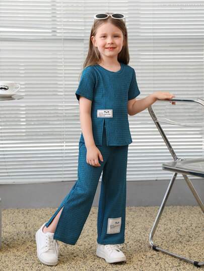 SHEIN Leap Crew Chica Joven con slogan con diseño de parche Camiseta & Pantalones de pierna ancha - Agua verde azul - Añade 1