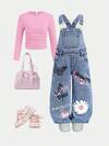 en Lavado medio Chicas jóvenes de mezclilla SHEIN Peto vaquero y monos para niñas jóvenes con decoración floral, pantalones de tirantes lindos con estilo Y2K, preppy y casual, vintage de los años 2000, con flores tridimensionales, bordados de flores moradas y blancas, cómodos de algodón vaquero suave para uso diario, salidas, escuela, viajes, fiestas, vacaciones, Halloween, Navidad, Año Nuevo Chino, diseño lavado de copos de nieve y bordados explosivos, pantalones vaqueros de pierna ancha para el primer día de escuela en otoño e invierno