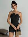 Olithes Mono negro liso y casual para mujer, sin mangas, corto, con cuello asimétrico y cinturón ajustable, mono curvo, mono negro, mono negro de un solo hombro para mujer